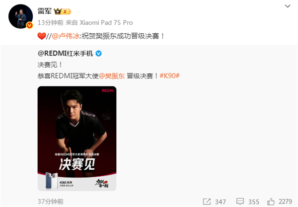 樊振东成功晋级决赛 雷军、卢伟冰、王腾发文祝贺