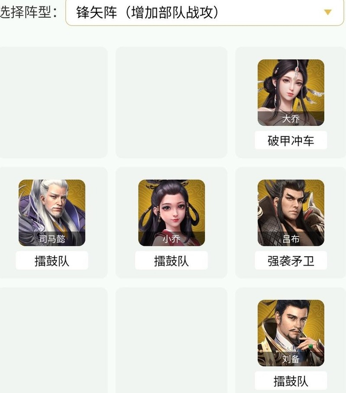推荐使用强化战法攻击的锋矢阵,以提升吕布的爆发能力。战斗中,大乔优先施放群体铁壁增益,为吕布创造安全输出环境;随后吕布全力释放技能收割战场,紧接着刘备及时补充士气,确保队伍持续作战能力。