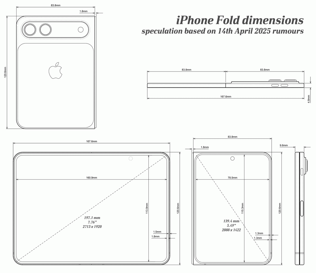 iPhone Fold 的外屏和内屏有可能落在 5.5 寸和 7.8 寸附近——并且内屏不是常见的正方形,而是一块长宽比约为 1.4 比 1 的宽屏,类似华为 Pura X。
