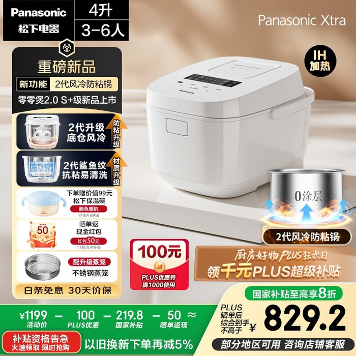 松下 Xtra 零零煲 2.0 电饭煲,享 20%补贴仅 1199 元