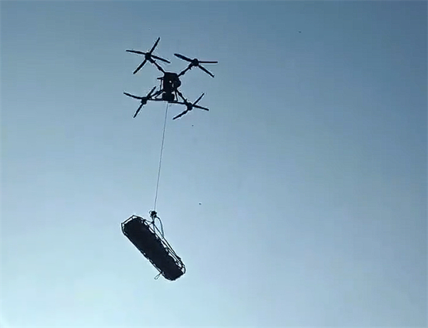 网友发布视频显示,一架工业无人机吊着担架,缓缓从山间升起,担架抬着的是一具遗体。
