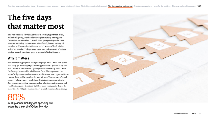 “黄金五天”期间(感恩节至网购星期一),39%的礼品预算集中投放,80%预算在网购星期一前用尽。零售商提前布局、分段促销以延长正价销售期,并通过限时加购和会员积分翻倍强化最后冲刺阶段转化。