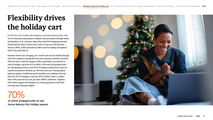 购物渠道方面,线上为51%,实体店为53%,几乎持平。支付方式方面,信用卡占52%、现金48%、礼品卡及预付卡27%、PayPal同样27%、“先买后付”BNPL为9%,显示出明显的预算控制趋向。履约环节,70%选择宅配,39%线上下单店内提货,30%偏好当日达服务。高效库存协同和智能订单路由成为零售末端体验关键。