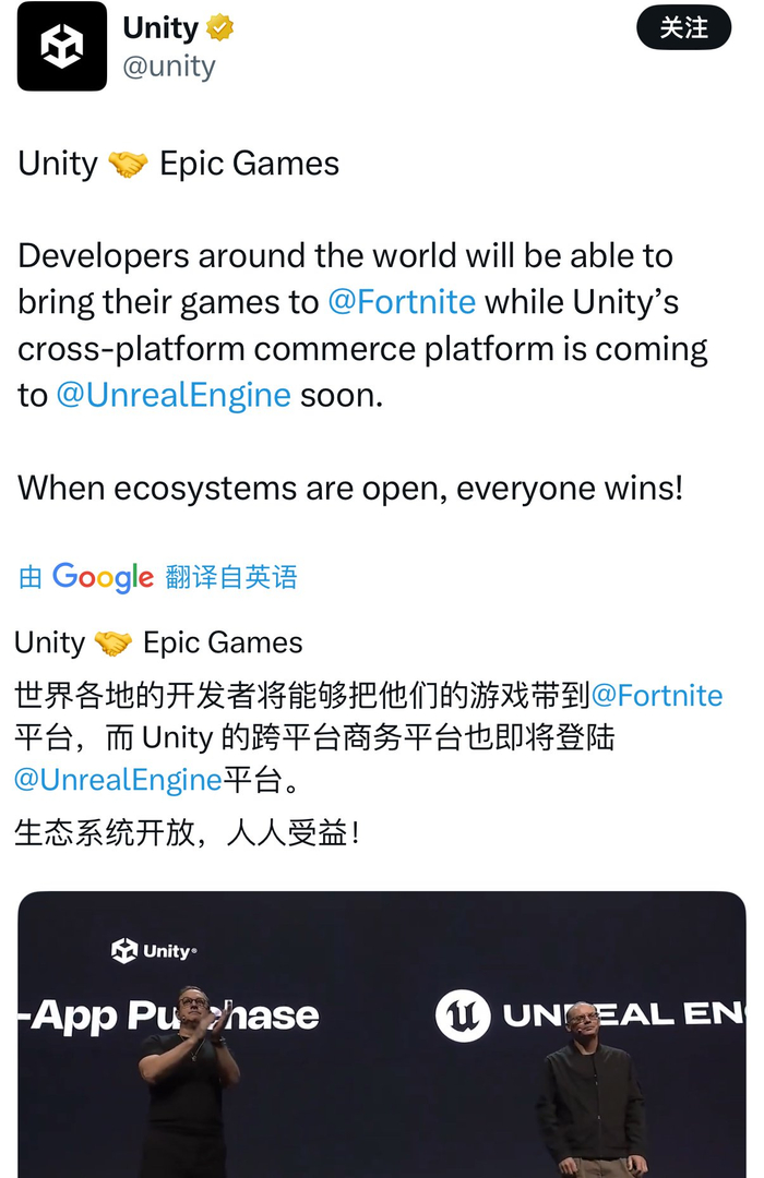 游戏行业又要见证历史了。11月19日,游戏引擎巨头Unity与虚幻引擎(UE)母公司Epic Games宣布双方达成一项全新合作,将Unity游戏引入《堡垒之夜》生态系统。