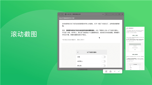 本次更新中,微信截图工具新增“滚动截图”选项,截图后点击即可向下滚动并生成长截图,使用更加高效便捷。