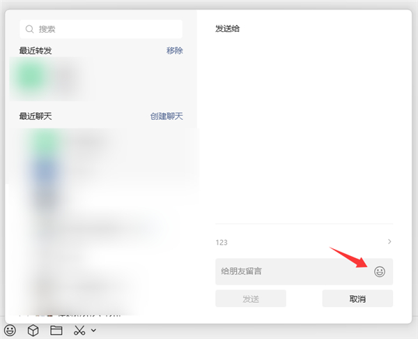 此外,在微信PC 4.1.5正式版中,聊天消息转发界面新增表情入口,用户可在留言框中直接插入表情,与文字一起发送,提升转发时的表达体验。