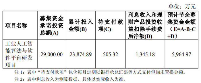 截至 2025 年 11 月 17 日,“工业人工智能算法与软件平台研发项目” 已完成全部研发工作并达成预期目标,正式结项。该项目承诺募集资金投资总额 2.9 亿元,累计实际投入 2.387489 亿元,待支付款项 505.32 万元,同时通过闲置资金现金管理获得利息及理财收益净额 1345.18 万元,最终形成节余募集资金 5964.97 万元。