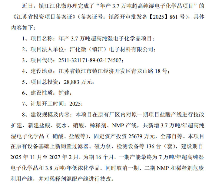 2025 年 11 月 19 日,江阴江化微电子材料股份有限公司(证券代码:603078,简称 “江化微”)发布项目进展公告,其全资子公司江化微(镇江)电子材料有限公司(简称 “镇江江化微”)投资的 “年产 3.7 万吨超高纯湿电子化学品项目” 已顺利取得《江苏省投资项目备案证》(备案证号:镇经开审批发备【2025】861 号),标志着该扩建项目正式进入落地实施阶段。