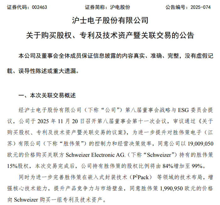 2025 年 11 月 21 日,沪士电子股份有限公司(证券代码:002463,简称 “沪电股份”)发布公告称,公司于 11 月 20 日召开第八届董事会第十一次会议,审议通过关联交易议案,拟以 1900.905 万欧元收购关联方 Schweizer Electronic AG.(简称 “Schweizer”)持有的胜伟策电子(江苏)有限公司(简称 “胜伟策”)15% 股权,并由胜伟策以 199.095 万欧元收购 Schweizer 旗下一组核心专利及技术资产,两项交易合计金额超 2100 万欧元。