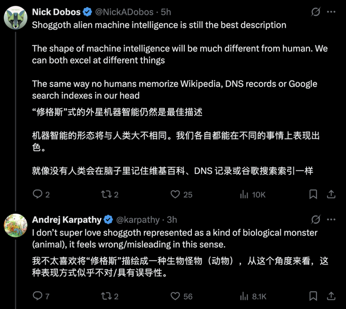 网友 Nick Dobos 在 Karpathy 推文下留言,将人工智能比做「修格斯」式的外星机器智能。