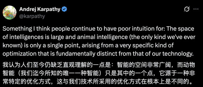 Karpathy 在推文中提到,智能的空间非常广阔,而动物智能(包括人类智能)只是其中的一个点。