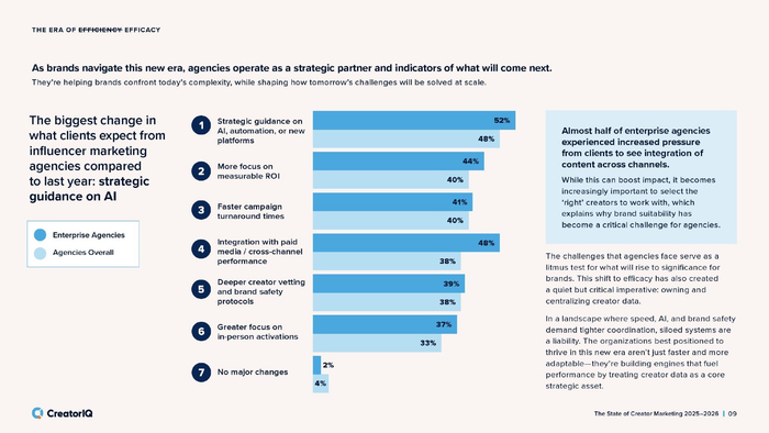 尽管如此,品牌安全显然是品牌最关心的问题,参与调查的代理商也将创作者合适度、风险缓解和法律合规性列为他们在创作者营销中面临的首要挑战。然而,除了审查创作者之外,投资回报率显然也至关重要,尤其是在经济波动时期。好消息是创作者营销的投资回报率似乎正在提高:65%的中型市场品牌表示,过去一年中其创作者营销项目的投资回报率显著(14%)或略有(51%)提高,74%的大型企业品牌也持相同看法(分别有21%和53%)。
