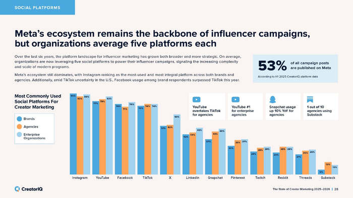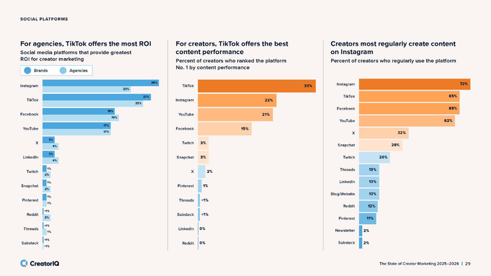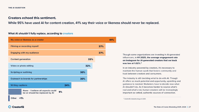 相反,对品牌而言最重要的是创作者的合适度或与品牌的契合度,22%的受访者指出了这一点。然而,在扩大合作规模时,保持这种契合度可能很困难:最近的一项研究发现,品牌在扩大创作者投资时面临的最大挑战是保持真实、高质量的内容和一致的品牌信息。