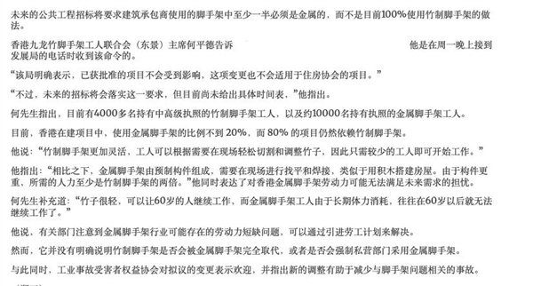 但要淘汰竹棚,对香港来说也面临着产业惯性的阻力。