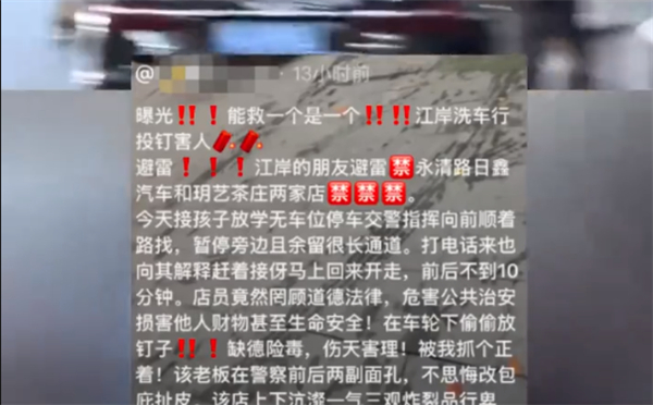 一名女子将车临时停在路边去接孩子,中途接到挪车电话返回时,竟撞见一旁汽车生活馆的员工在她的轮胎下放置铁钉。