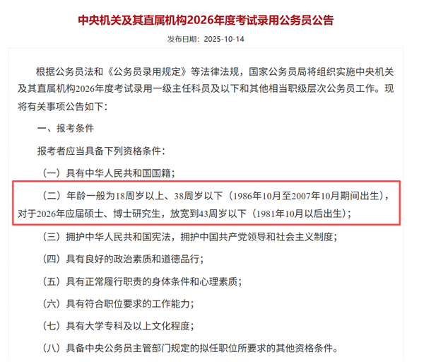 中央机关及其直属机构2026年度考试录用公务员公告显示,报考者年龄一般为18周岁以上、38周岁以下(1986年10月至2007年10月期间出生),对于2026年应届硕士、博士研究生,放宽到43周岁以下(1981年10月以后出生)。