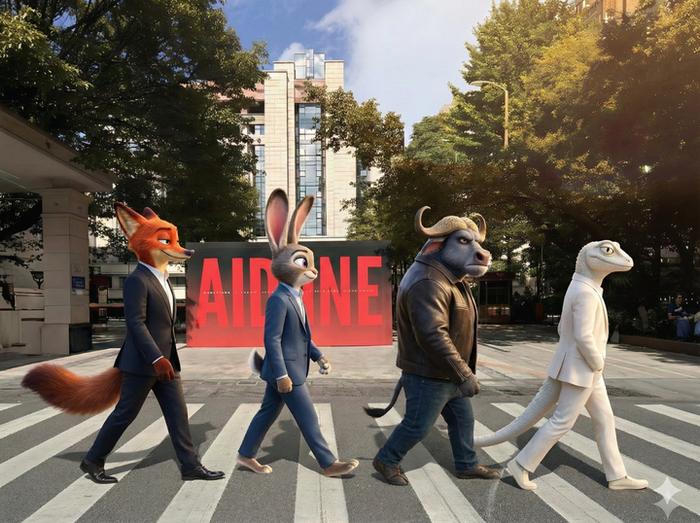 拿着这套提示词,几乎可以把所有的照片,都转成这种现实+疯狂动物城的风格。还记得我们之前 AI DONE 活动预告里面,4 位 AI 大佬走在斑马线上吗,现在你还能不能,分辨出从左到右都是谁。