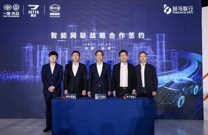 根据公开信息, 2020年9月17日,在2020杭州云栖大会上,斑马智行和一汽大众在线签署战略合作协议。2021年10月20日,在2021云栖大会上,斑马智行与一汽大众捷达品牌、摩斯智联举行智能网联战略合作签约仪式。