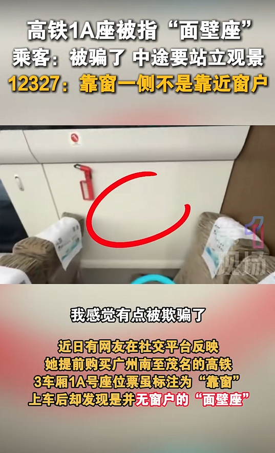 据媒体报道,11月初,有网友发帖称,她提前购买广州南至茂名的高铁3车厢1A号座位票,票面虽标注为“靠窗”,上车后却发现是并无窗户的“面壁座”。