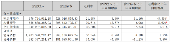 此外,毛利率的变化也值得关注。尽管德尔玛在业内以代工小米、飞利浦而出名,但三大品类中有两大品类出现了毛利率下降的情况。根据半年度财报,其家居环境类产品毛利率同比下降5.51%,水健康类产品毛利率同比提升5.63%,个护健康类产品毛利率同比下降1.01%。