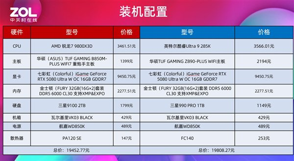接下来我们再给大家推荐一套AMD 锐龙 7 9800X3D平台的主机,并同样对比英特尔酷睿Ultra 9 285K平台,看看两者之间的装机价格差异。