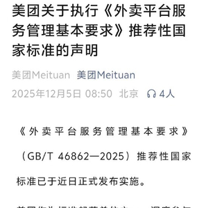 新浪科技讯 12月5日上午消息,近日,《外卖平台服务管理基本要求》(GB/T 46862—2025)推荐性国家标准正式发布实施。