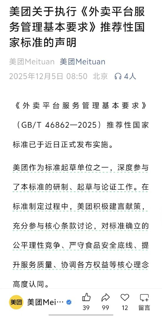 美团官方宣布,美团作为标准起草单位之一,深度参与了本标准的研制、起草与论证工作。在标准制定过程中,美团积极建言献策,充分参与核心条款讨论,对标准确立的公平理性竞争、严守食品安全底线、提升服务质量、协调各方权益等核心理念高度认同。