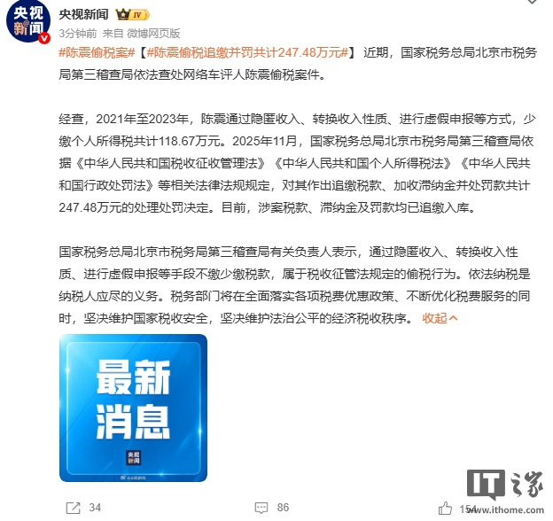 IT之家 12 月 5 日,据央视报道,国家税务总局北京市税务局第三稽查局近期依法查处网络车评人陈震偷税案件。