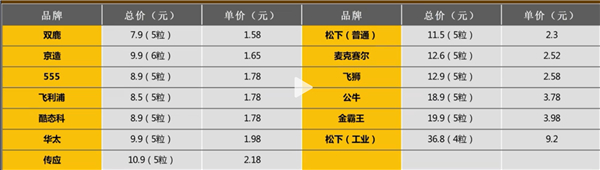 首先在价格方面,双鹿、京造、555、飞利浦、酷态科、华太的单粒价格都在2元以内,松下车钥匙专用款价格最贵,单价达到了9.2元,不知道品质能否对得起这个价格。