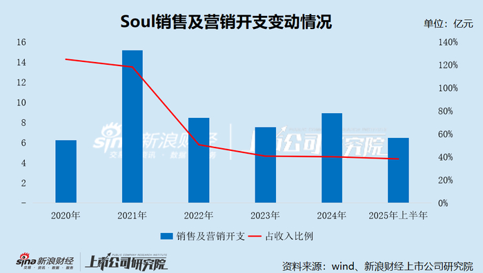 究其原因,Soul在“砸钱换量”上更克制了。报告期内,Soul用于销售及营销方面的开支分别为8.44亿元、7.52亿元、8.89亿元及6.45亿元,分别占同期收入的50.6%、40.7%、40.2%及38.3%。反观2020年及2021年,其销售费用占比一度高达124%及118%,严重侵蚀了利润。