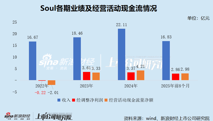 数据显示,Soul的经营业绩增势迅猛,各报告期的收入分别为16.67亿元、18.46亿元、22.11亿元及16.83亿元;净利润分别为-2189.8万元、3.61亿元、3.37亿元及2.86亿元,三年半净赚9.63亿元;毛利率分别为86.30%、85.50%、83.70%及81.50%,始终保持在80%以上的较高水平;经营活动现金流量净额分别为-2.01亿元、3.33亿元、4.21亿元及2.98亿元。