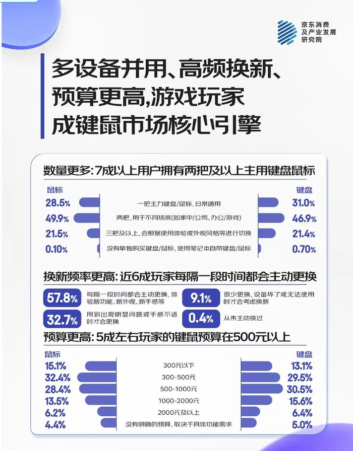 根据京东研究院数据,磁轴键盘(62.5%)、轻量化鼠标(60.1%)与光轴键盘(58.3%)为玩家票选的TOP3 “电竞外设” 代表品类,并加速向主流市场渗透;在深度游戏玩家中,磁轴、光轴键盘渗透率接近五成,并逐步延伸至非游戏用户群体。