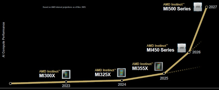 AMD对MI500系列GPU没有太多透露,但这里有一个相对的性能路线图: