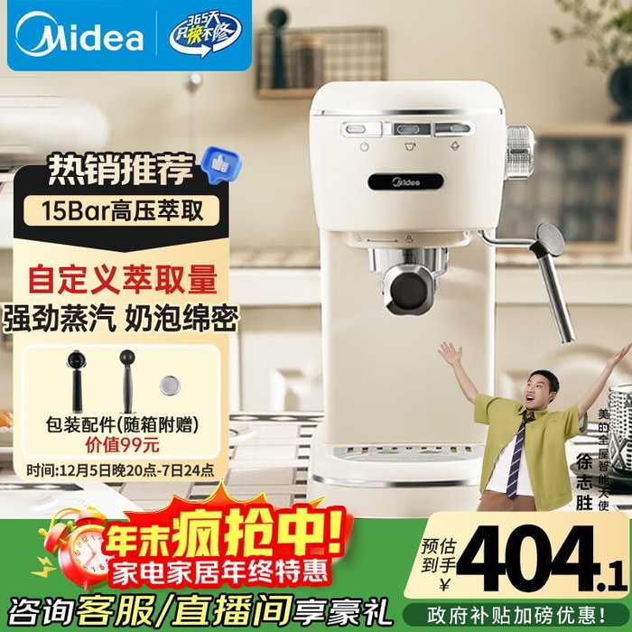 美的半自动咖啡机奶泡机,满 1 元打 9 折仅 404.1 元