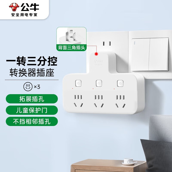 公牛品字形一转三转换插头促销,到手仅33.4元!