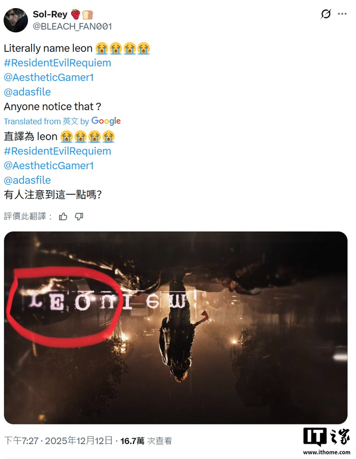 随后 X 平台用户 Sol-Rey 和 KATHYANHY 发现,卡普空在游戏的所有预告片中都暗藏了小细节,如果将片中最后几秒的“Requiem”(安魂曲)字母倒过来看的话,就能找出完美对齐的“LEON”(里昂)字母,只不过当时许多玩家都没注意到这点。