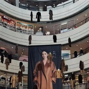 原来,商场中庭悬挂着数十件长大衣,这些大衣悬挂高度参差不齐,错落分布在整个中庭空间,而中间位置还摆放着该品牌代言人的巨幅海报,如此布置引发了众多网友关注与讨论。