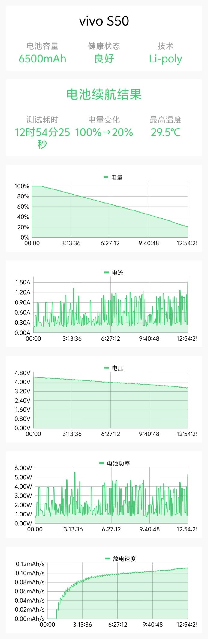 测试结果显示,vivo S50在测试中坚持了12小时54分。折算下来整机满电续航能坚持16小时。超长的续航时间完全能够撑起2天一充。