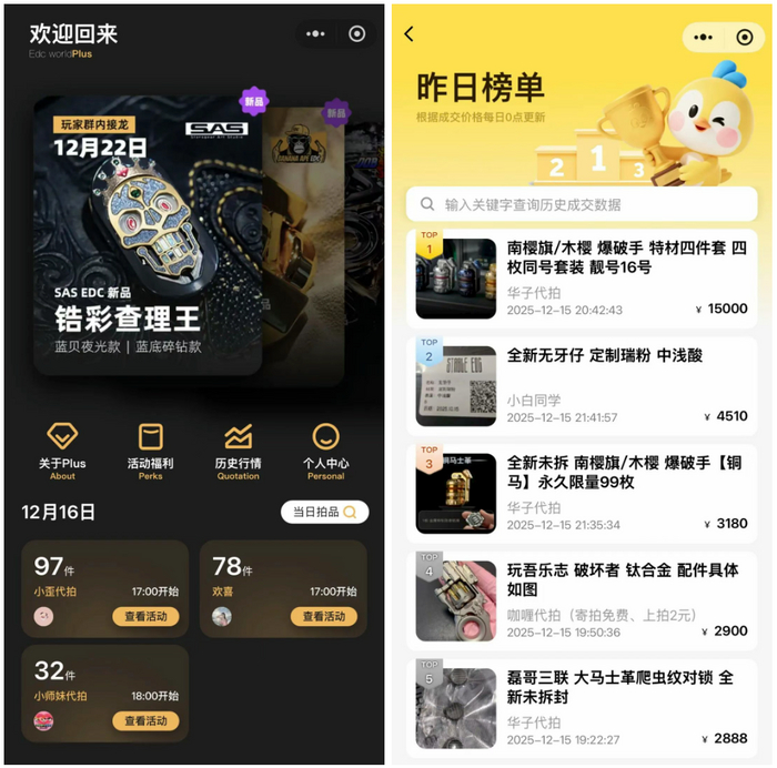在“EDC世界plus”,出价统一用“XX像素”替代价格。圈内人称:“这是为了规避一些东西,以免招来投诉和举报。”小程序内还有“历史行情”,会公布前一日交易价格TOP20的产品,通常价格在1400-6000元之间。