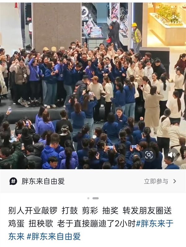 网友称,别人开业都是敲锣打鼓、扭秧歌、送鸡蛋,于东来开业直接蹦了2个小时迪。