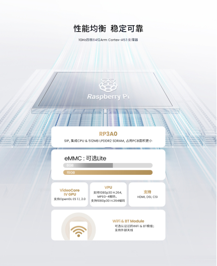 IPC1100搭载树莓派自研RP3A0 SIP 芯片组,其核心为 4 核 64 位 Arm Cortex-A53 处理器,主频高达 1GHz,并配备 VideoCore IV GPU,支持 OpenGL ES 1.1 和 2.0。支持 1080p30 H.264、MPEG-4 解码以及 1080p30 H.264 编码。
