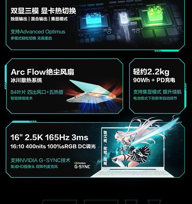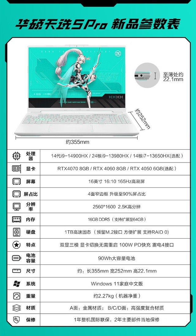 (中关村在线 四川行情)华硕天选5 Pro是一款专为游戏玩家和高性能需求用户打造的顶级设备。搭载最新14代英特尔酷睿i9 14900HX处理器,配备NVIDIA RTX4070显卡,支持双显三模热切换,带来强劲性能表现。机身采用次元机甲设计,提供魔幻青和日蚀灰两种配色,轻约2.27kg且内置90Wh大容量电池,兼顾便携与续航。屏幕为16英寸2.5K高分辨率电竞屏,支持165Hz刷新率、100% sRGB广色域以及G-Sync技术,显示效果出色。同时配备1TB PCIe4.0 SSD和16GB D5高速内存,并预留扩展插槽,满足未来升级需求。散热系统采用冰川架构,Arc Flow绝尘风扇搭配四出风口和五热管设计,确保性能持久稳定释放。此外,该机还支持杜比全景声、Hi-Res认证音效,全尺寸炫彩背光键盘、双阵列麦克风及100W快充等功能,接口丰富实用。
