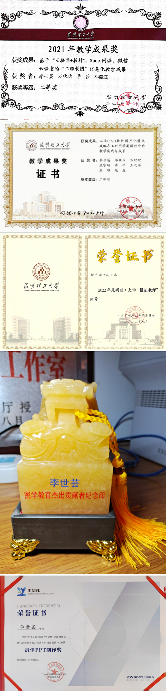 这一教学改革成效显著,学生考试成绩明显提高,及格率达到90%以上。该教学改革成果荣获昆明理工大学2021年教学成果二等奖、2025年教学成果二等奖(每4年评一次),李世芸教授也荣获昆明理工大学2022年“模范教师”称号和中国图学学会制图专业技术委员会颁发的“图形教育杰出贡献者”纪念印章。