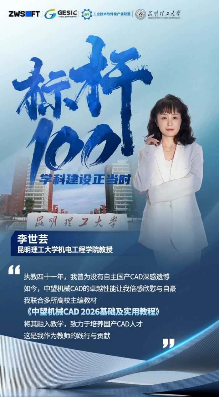 【编者按】为助力教育强国建设,构建行业多方共赢的生态合作体系,由中望软件牵头与国家工业软件行业产教融合共同体、工业技术软件化产业联盟、广东省工业软件创新中心、工业产品设计与仿真软件创新联盟等单 位携手,联合推出“标杆100”案例采集栏目,邀请100位教育行业标杆先行者,分享在培养国家战略人才过程中的实践和经验。本期走进昆明理工大学,以下根据机电工程学院李世芸教授的教育实践经验整理。