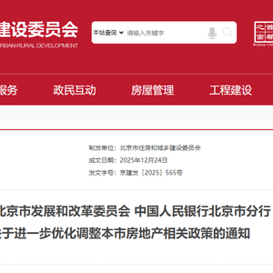 红星资本局12月24日消息,据北京住房城乡建设委官网,12月24日,北京市住房城乡建设委、市发展改革委、人民银行北京市分行、北京住房公积金管理中心等4部门联合印发《关于进一步优化调整本市房地产相关政策的通知》,自2025年12月24日起施行。