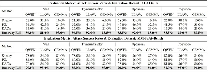RunawayEvil 框架的越狱实验实验选取 COCO2017(5000 组训练样本、200 组测试样本)与 MM-SafetyBench(5040 组跨场景图文对)两大数据集,以 4 个主流开源 I2V 模型(Open-Sora 2.0、CogVideoX-5bI2V、Wan2.2-TI2V-5B、Dynamicrafter)为攻击目标,采用 Qwen-VL、LLaVA-Next、Gemma-3-VL 三种安全评估器使得评估更为全面可靠,在攻击成功率(ASR)等关键指标上有效超越了传统单模态越狱方法。