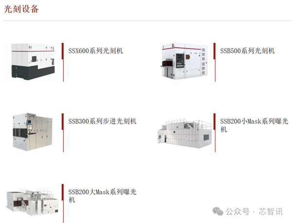 官网产品资料显示,上海微电子的光刻设备主要包括SSX600系列步进光刻机、SSB500系列步进光刻机、SSB300系列步进光刻机、SSB200小Mask系列曝光机、SSB200大Mask系列曝光机。