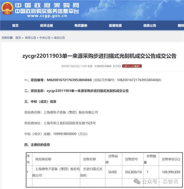 据中国政府采购网12月25日披露的公告显示,国产光刻机厂商上海微电子装备(集团)股份有限公司(以下简称“上海微电子”)中标了一台步进式扫描光刻机,成交金额约为1.1亿元。