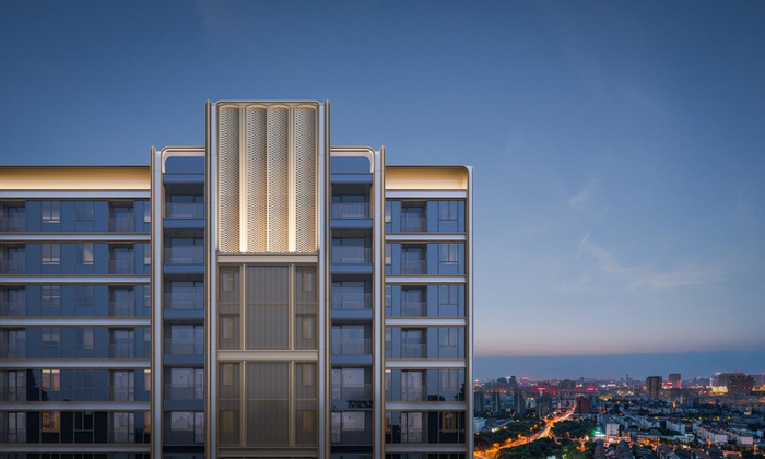 同时,保利·朝观天珺项目的设计更具有“京范儿”,其主入口采用京式拱券门形制,通过精工线条和对称门廊重构归家礼序;顶部的“鎏金冠顶”,灵感源自传统的琉璃瓦,利用金属拱架打造出现代感十足的精神图腾,与北京国贸CBD相呼应。外立面更为特别,其使用了非遗数字化窑变技术制作的钧瓷天青陶板,每块纹理独一无二,彰显工艺之美,日间建筑表皮呈液态鎏金质感,夜间智能泛光系统使其化身金色灯塔,成为朝阳北路极具辨识度的天际线地标。