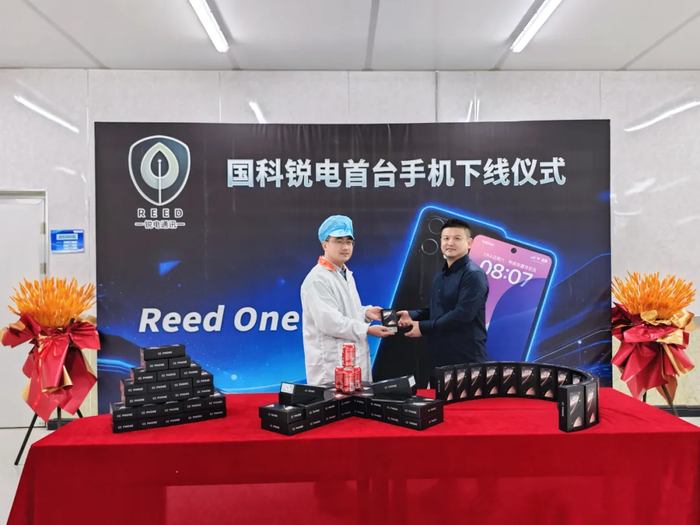 C114讯 12月26日消息(云青)据安徽国科锐电通讯科技有限公司官方公众号发布消息,12月11日,首批Reed One GK5手机下线仪式于工厂举行。国科锐电丁锋副总经理和工厂的生产经理共同拉下红色绸布。